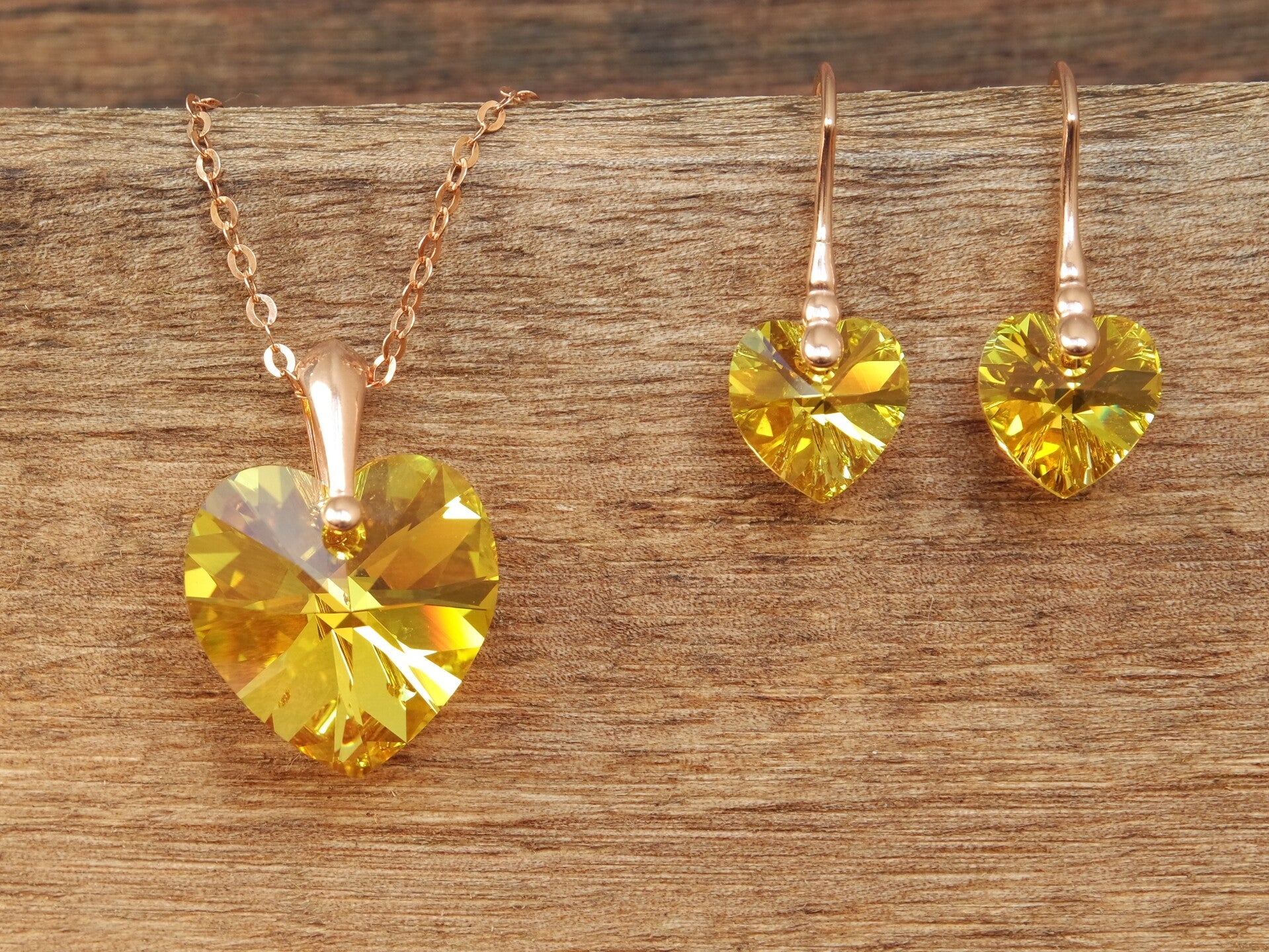 Deze ketting en oorbellen met Swarovski kristallen zijn gemaakt van sterling zilver, verguld met een laagje rosé- goud.