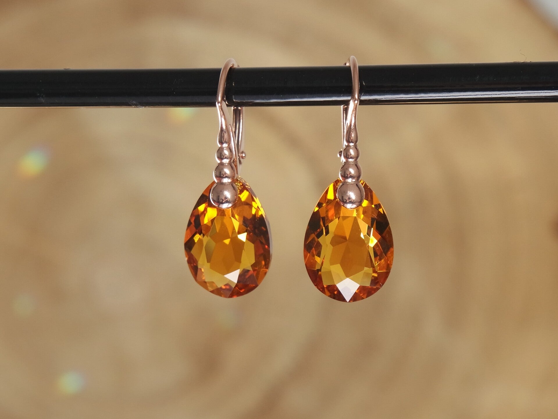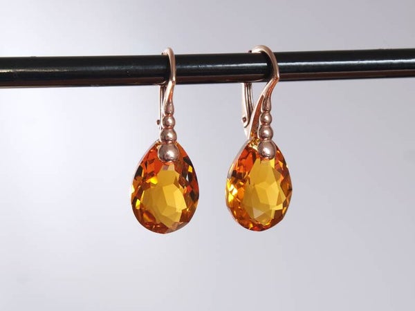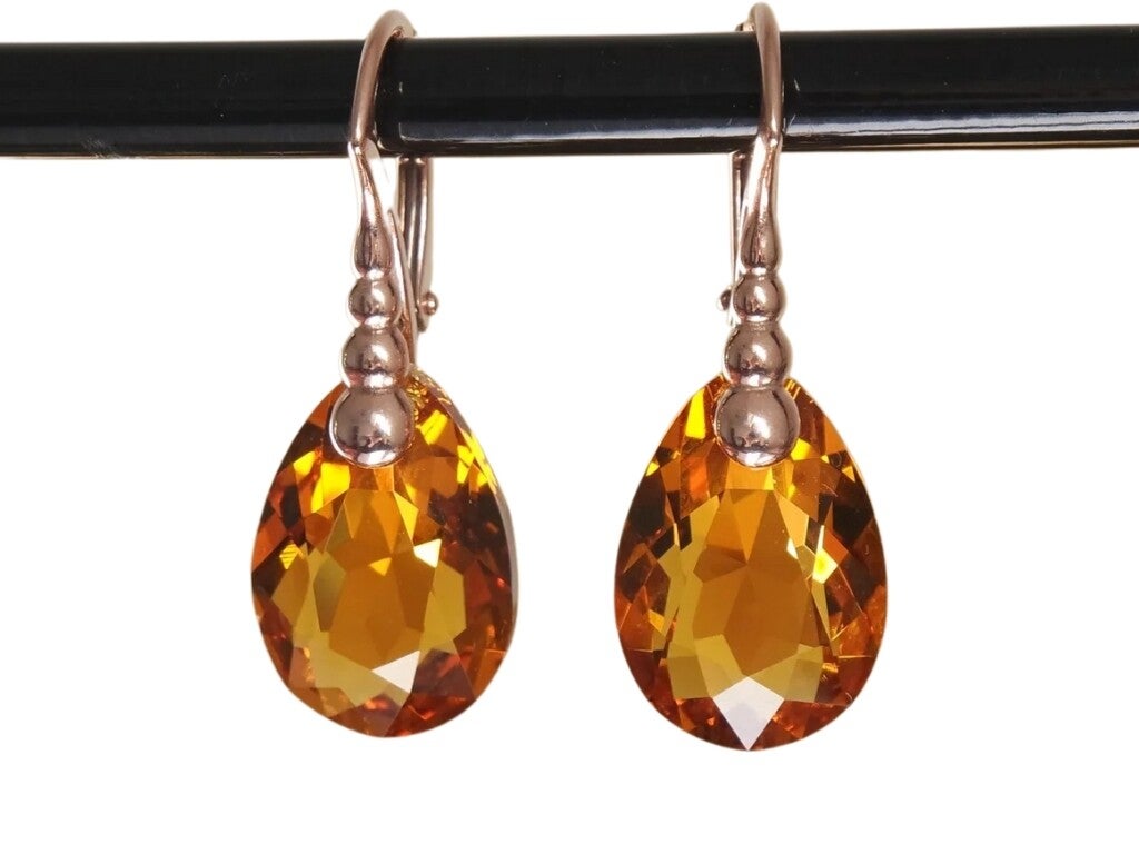 Sterling zilveren gesloten oorbellen, verguld met 18K roségoud en met echte Swarovski elements: 15mm lange druppels in de kleur Topaz