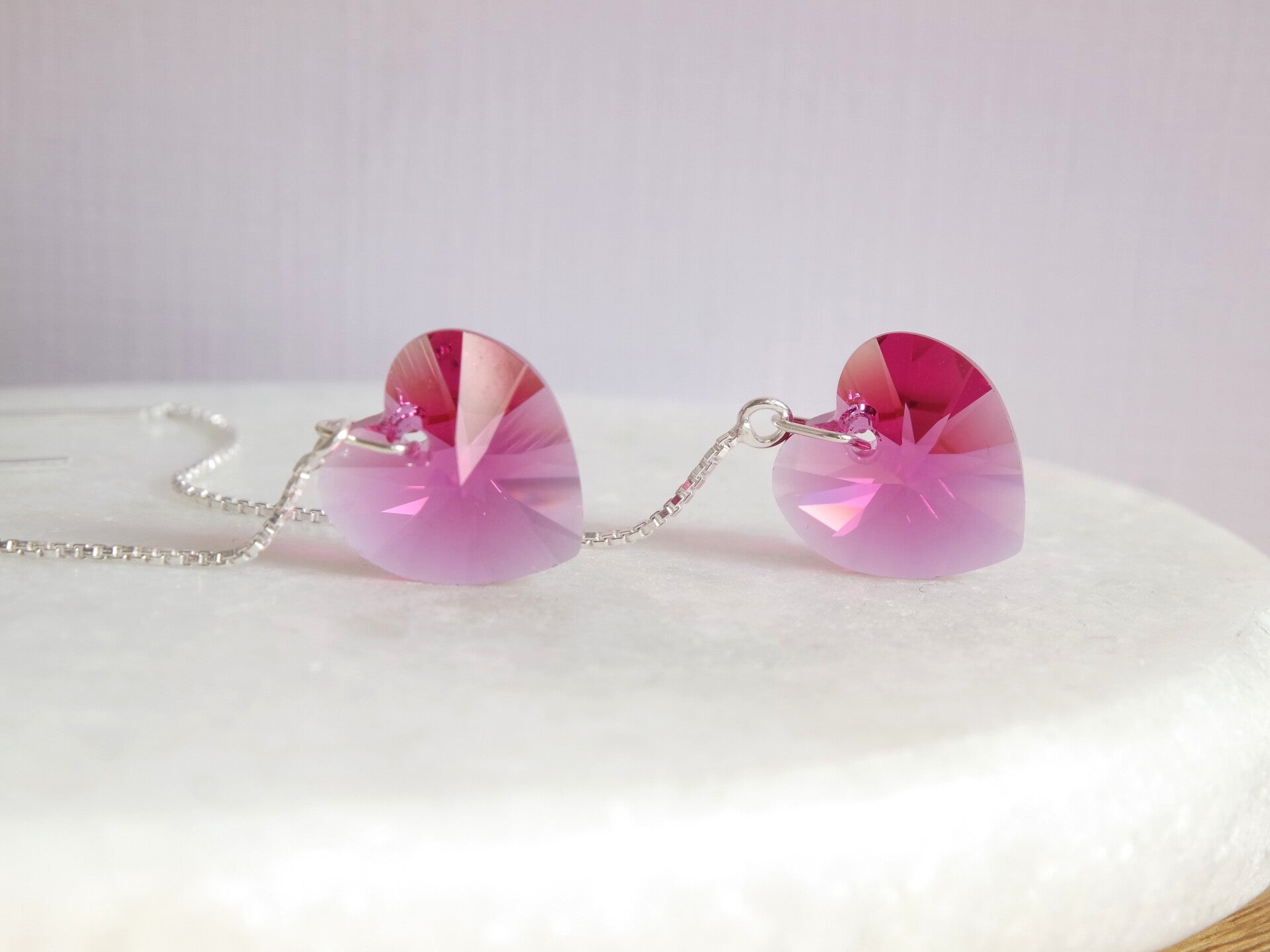 Sterling zilveren oorbellen met echte Swarovski elements: 14mm grote hartjes in de kleur Fuchsia. De totale lengte van de oorbellen is ongeveer 97mm.