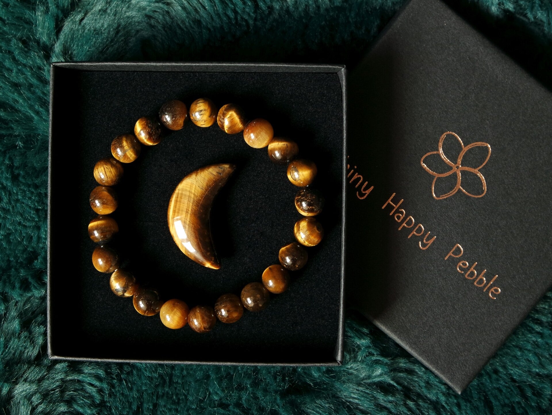 De elastische armband in deze geschenkverpakking heeft een standaardformaat (circa 18,5 cm, tussen de 17-20 cm lang) of een groter formaat (ook voor heren, circa 21,5cm, tussen de 20 en 23cm lang. De edelsteenkralen hebben een diameter van circa 8 mm. De maan van tijgeroog is ongeveer 3 cm lang.