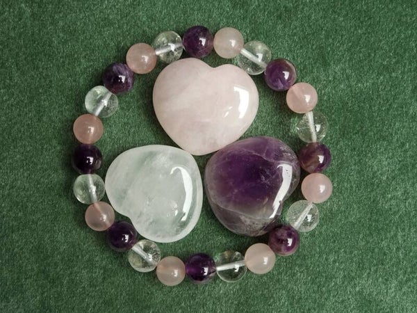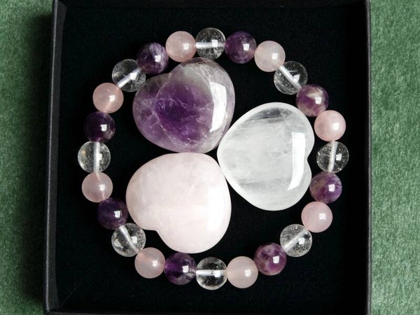 Armband: bergkristal, rozenkwarts en amethist. Deze krachtige kristallen versterken elkaar.