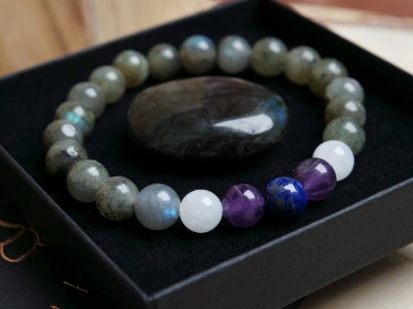 Edelsteenset bestaande uit een edelsteen-armband van labradoriet, regenboog-maansteen, amethist en lapis lazuli plus een steen van labradoriet, verpakt in een cadeaudoosje en ingepakt verzonden. Deze edelsteen-set is een mooi cadeau voor jezelf of een geliefde.