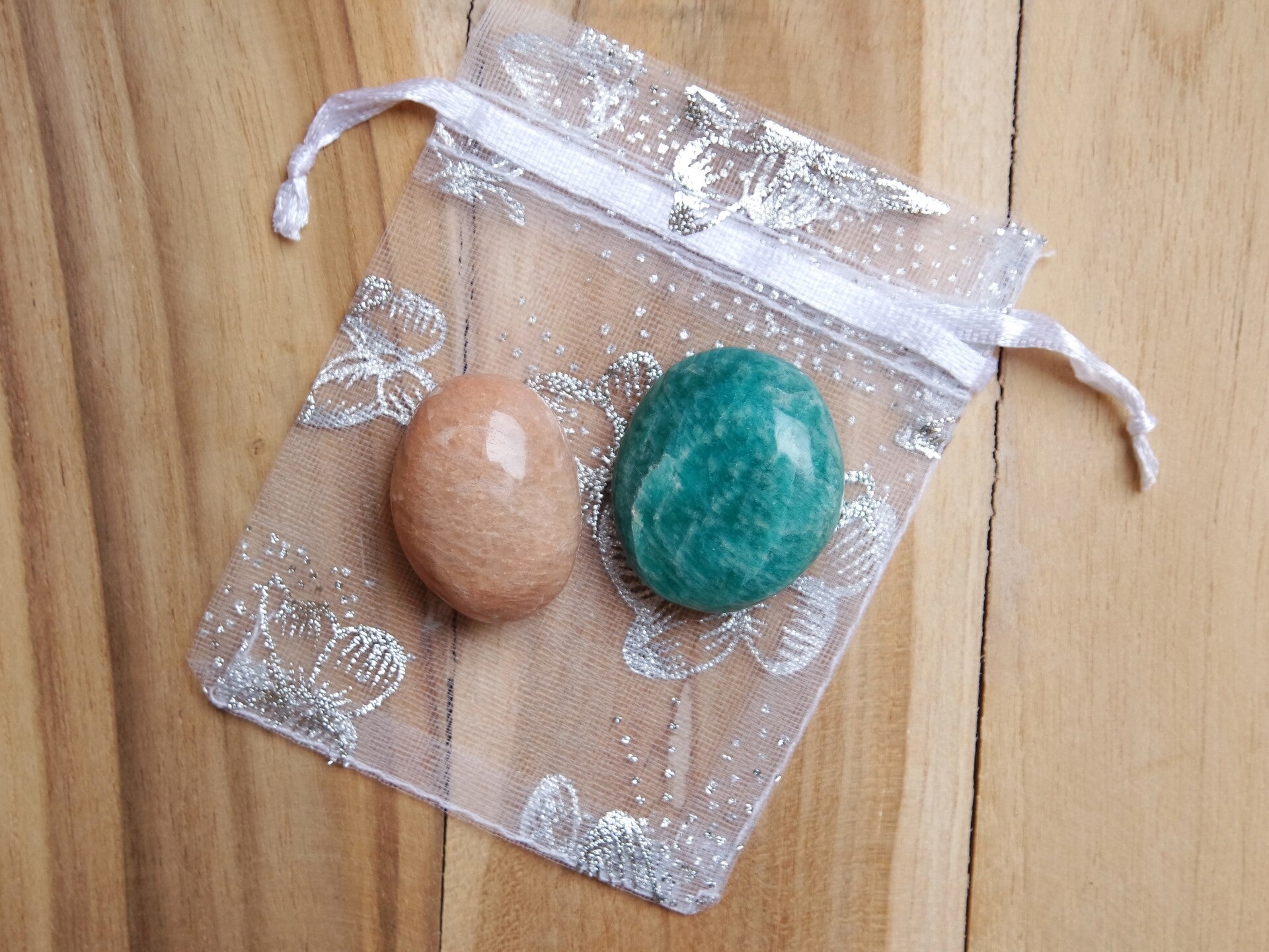 Edelsteenset bestaande uit zakstenen van amazoniet en maansteen, verpakt in een cadeauzakje.