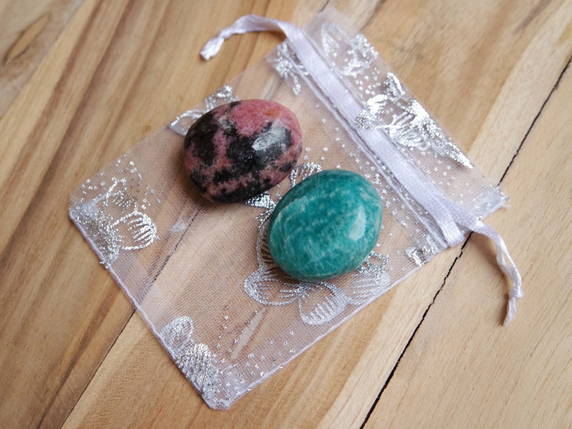 Edelsteenset bestaande uit zakstenen van amazoniet en rhodoniet, verpakt in een cadeauzakje.