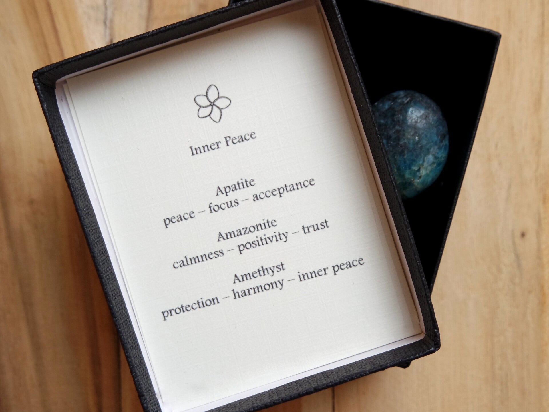 Edelsteenset bestaande uit zakstenen van amethist, amazoniet en apatiet, verpakt in een cadeaudoosje.