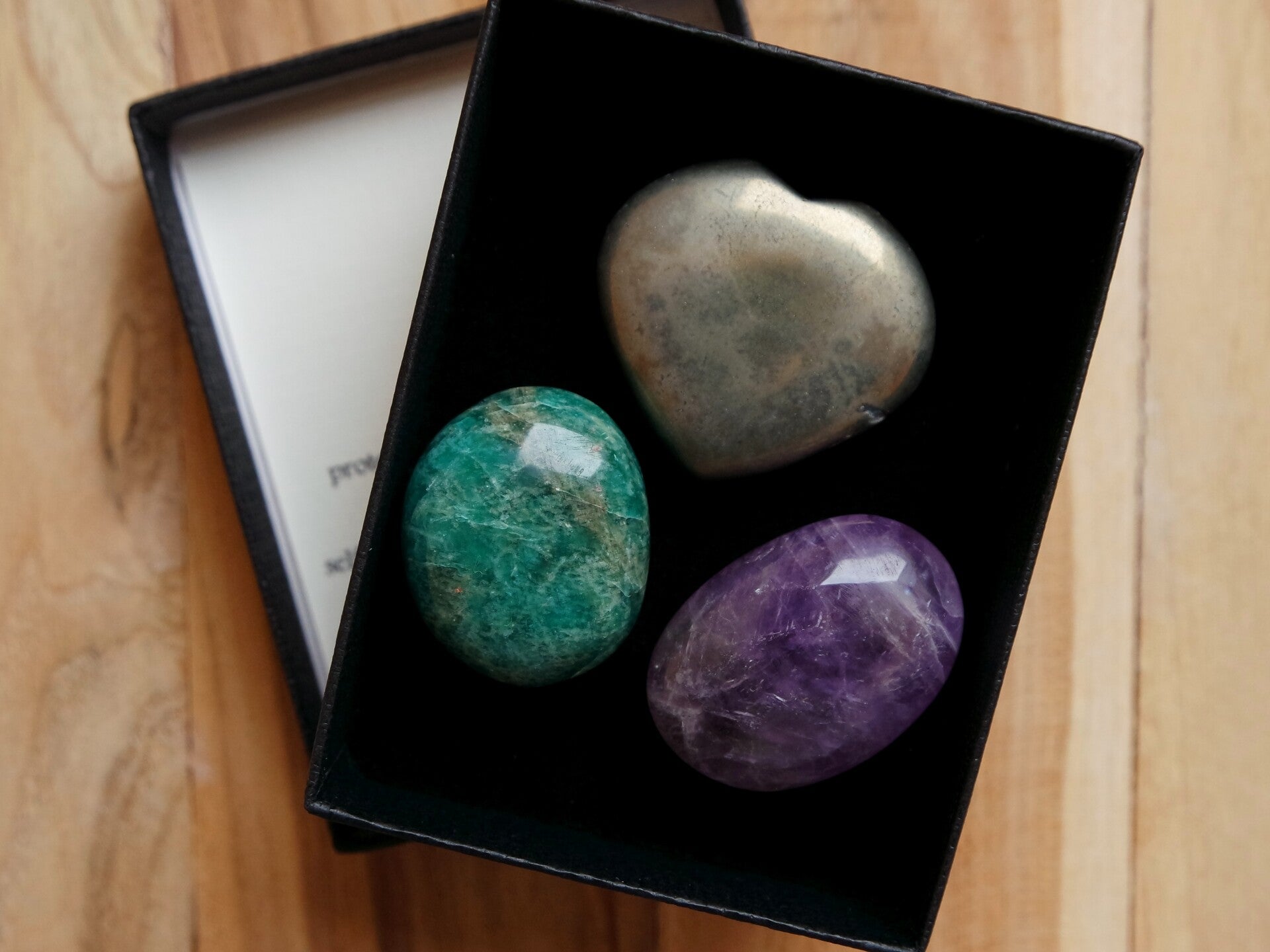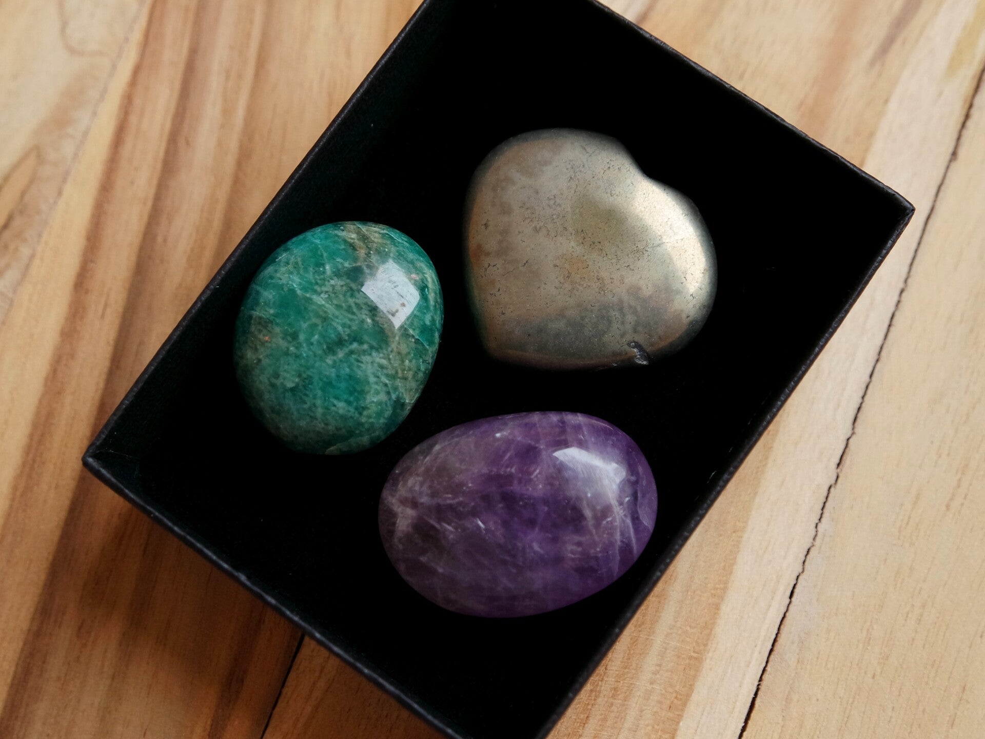 Edelsteenset bestaande uit zakstenen van amethist, amazoniet en pyriet (hart), verpakt in een cadeaudoosje.