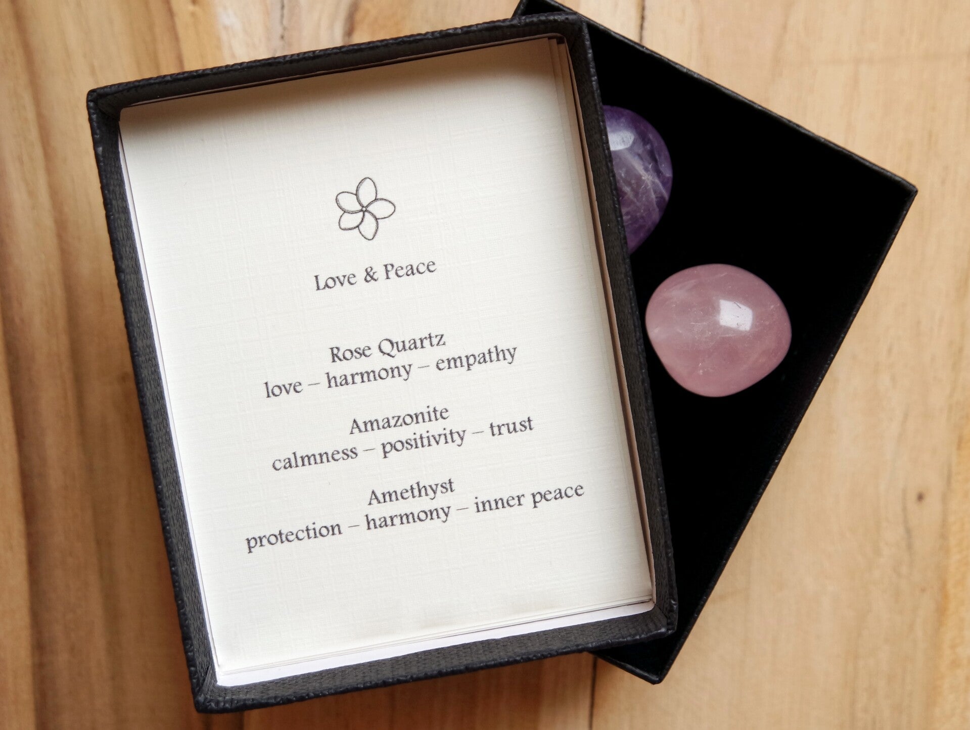 Edelsteenset bestaande uit zakstenen van amazoniet, ster-rozenkwarts en amethist, verpakt in een cadeaudoosje.