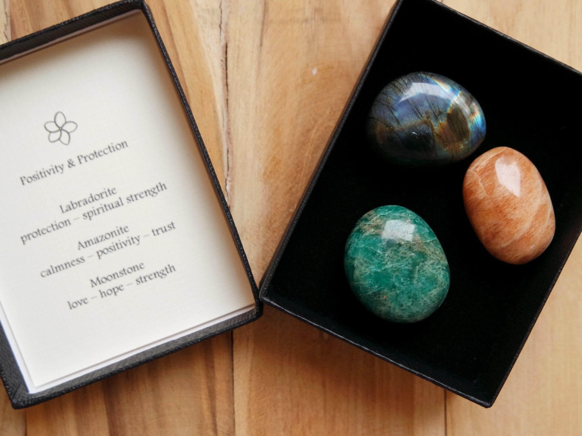 Edelsteenset bestaande uit zakstenen van labradoriet, maansteen en amazoniet, verpakt in een cadeaudoosje.