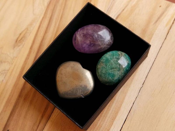 Edelsteenset bestaande uit zakstenen van amethist, amazoniet en pyriet (hart), verpakt in een cadeaudoosje.