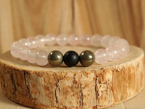 Edelsteenset bestaande uit een edelsteen-armband van pyriet, onyx en rozenkwarts plus een hart en maan van rozenkwarts, verpakt in een cadeaudoosje en ingepakt verzonden. Deze edelsteen-set is een mooi cadeau voor jezelf of een geliefde.