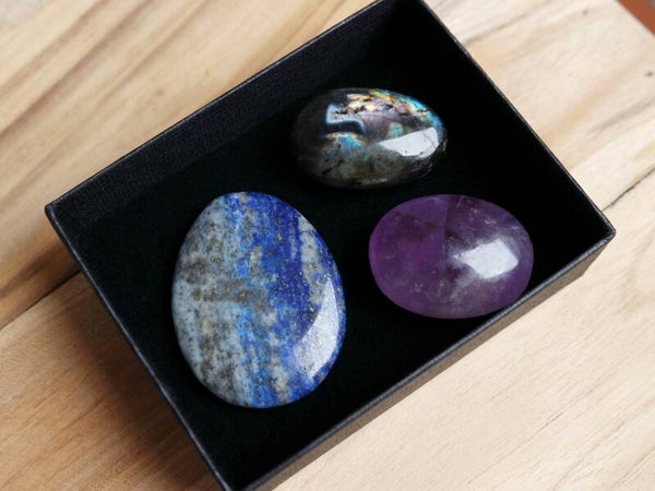 Edelsteenset bestaande uit zakstenen van lapis lazuli, labradoriet en amethist, verpakt in een cadeaudoosje.