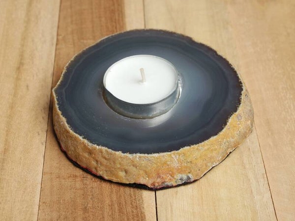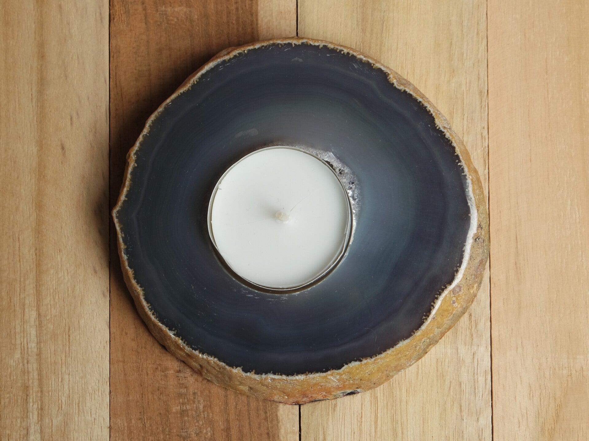 Waxinelichthouder gemaakt van agaat, met de hand gemaakt in Brazilië. Het gaat hier om een uniek product: de waxinelichthouder die staat afgebeeld is ook het precieze item dat je ontvangt.