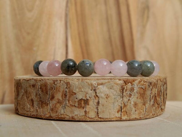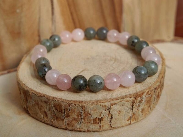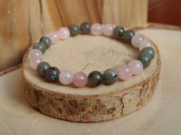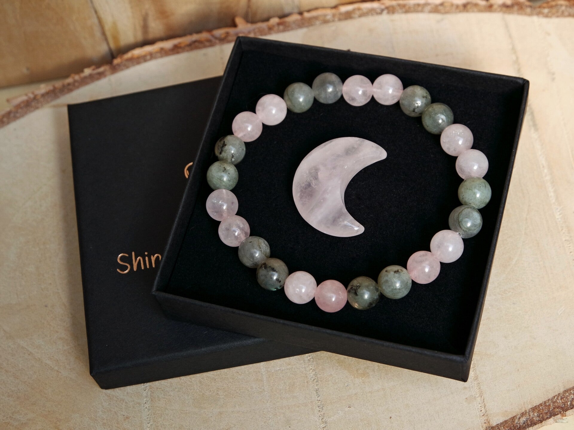 Edelsteenset bestaande uit een edelsteen-armband van labradoriet en rozenkwarts plus een maan van rozenkwarts, verpakt in een cadeaudoosje en ingepakt verzonden. Deze edelsteen-set is een mooi cadeau voor jezelf of een geliefde.