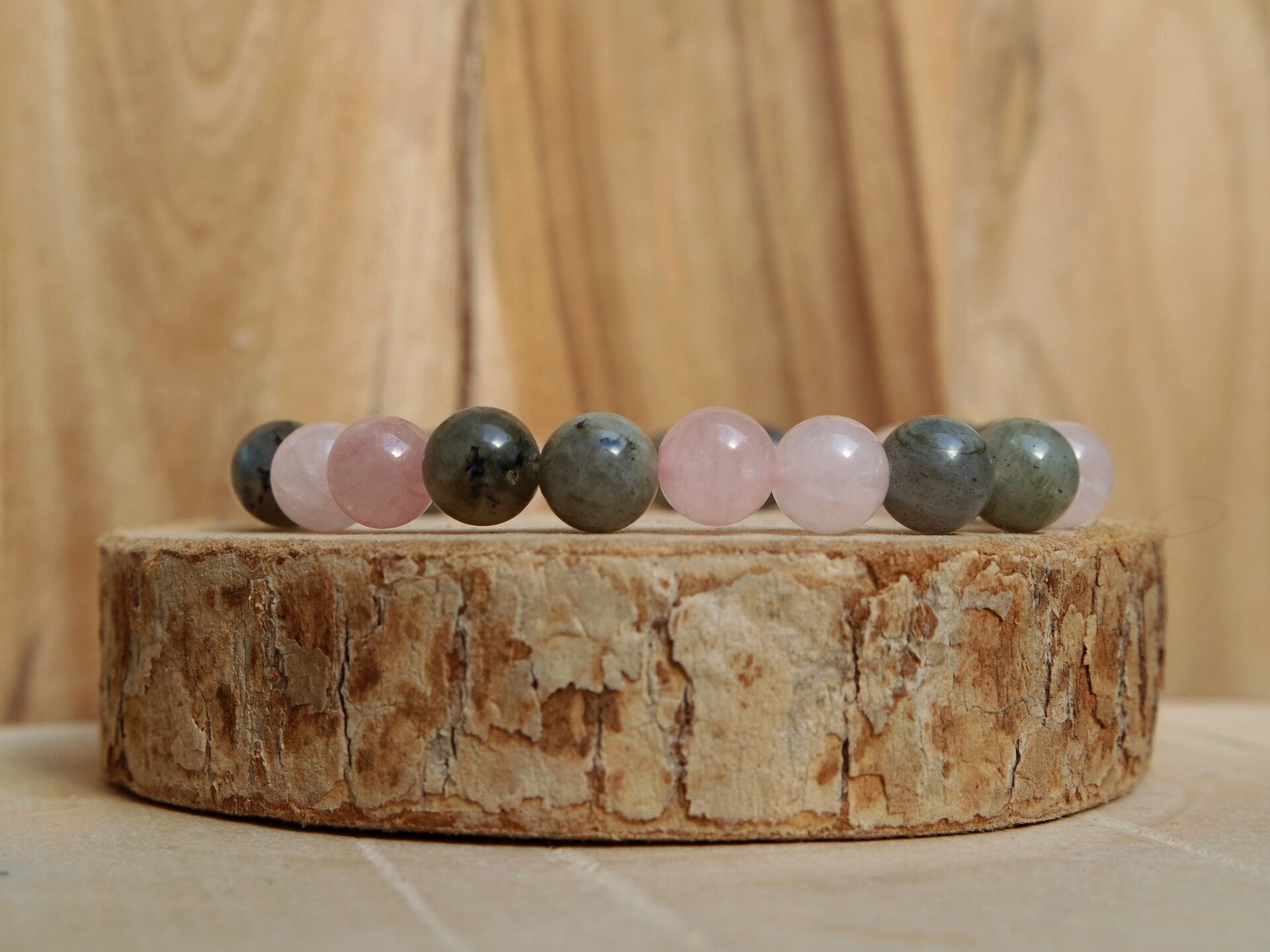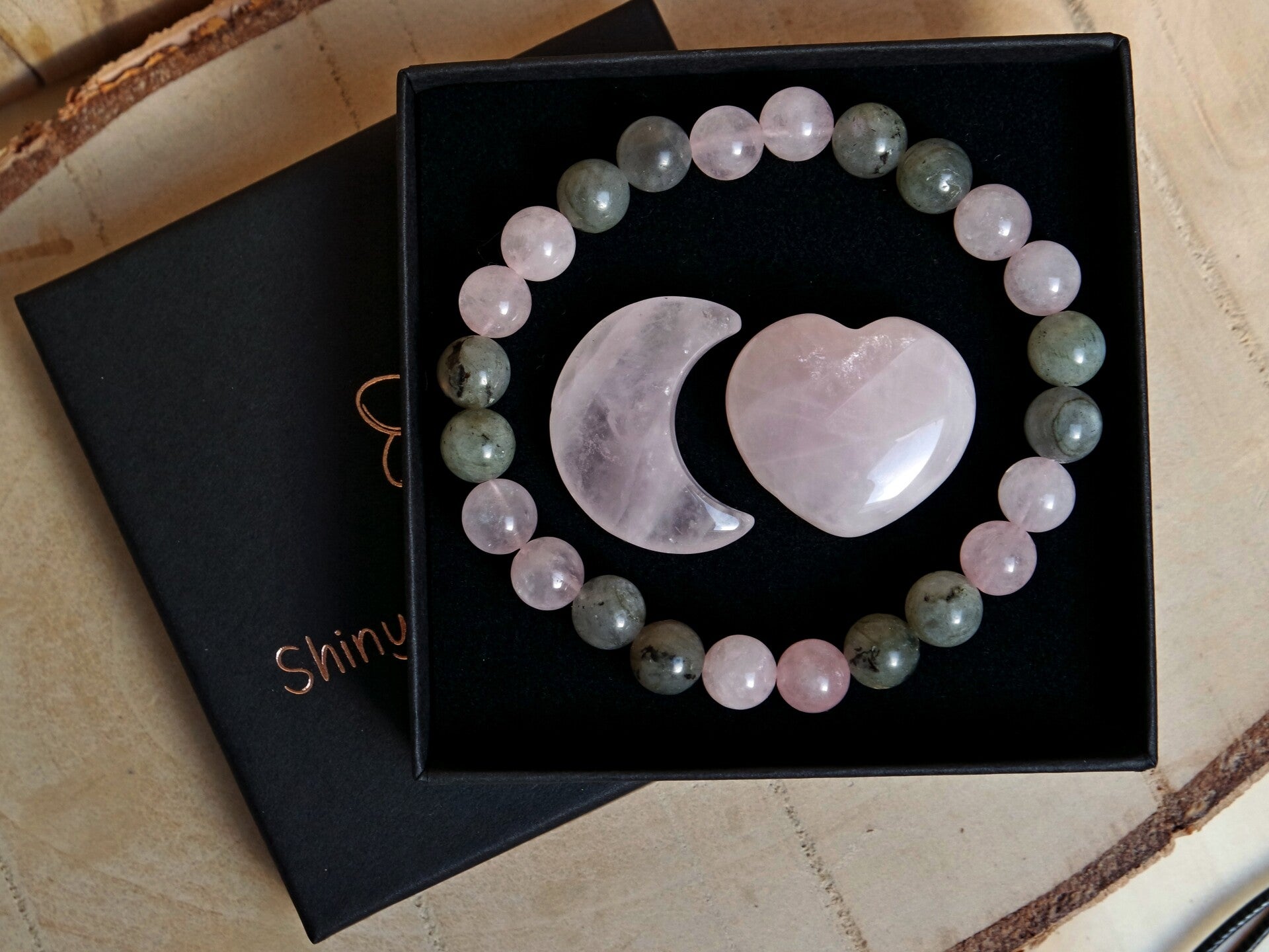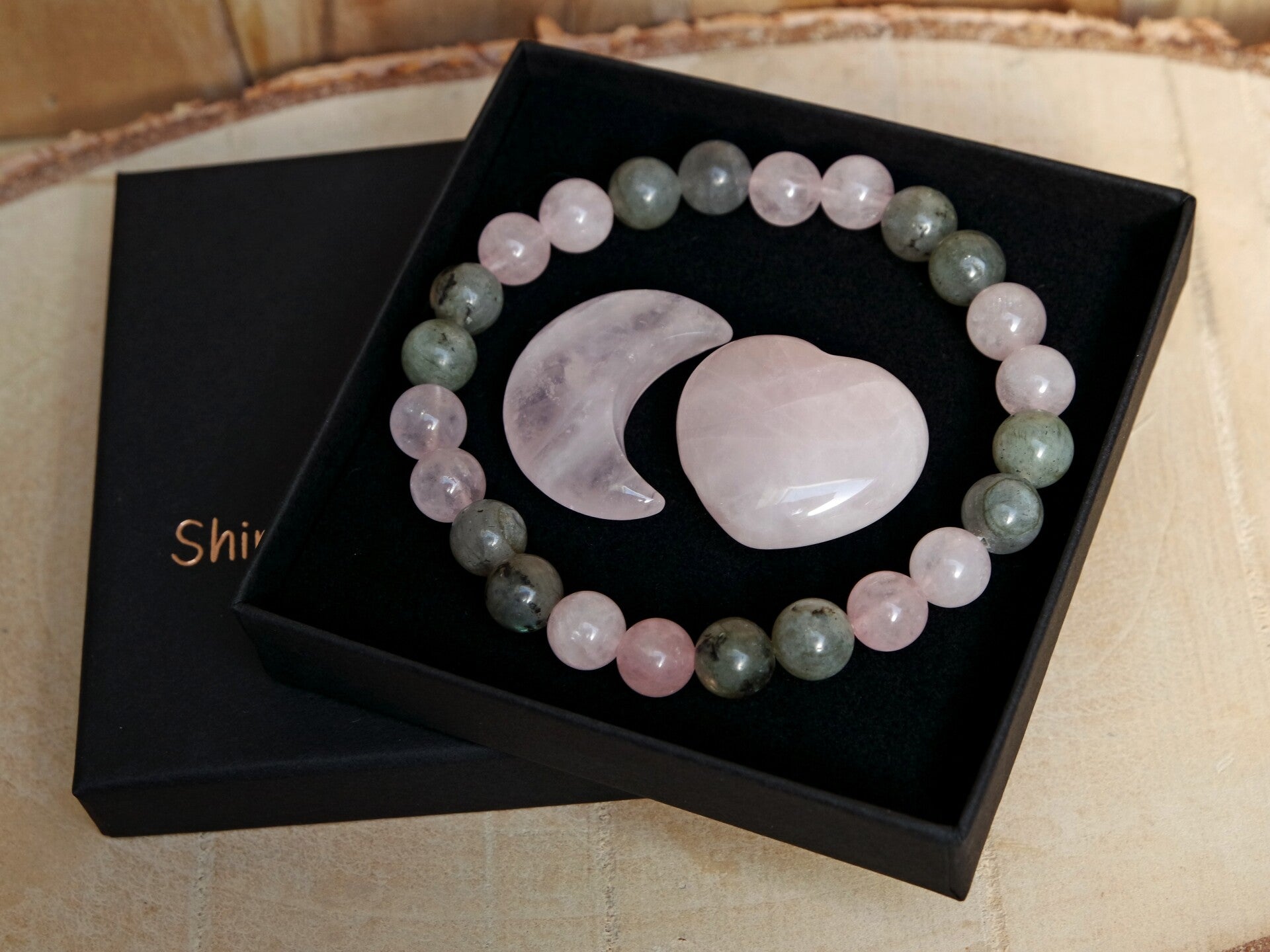 Edelsteenset bestaande uit een edelsteen-armband van labradoriet en rozenkwarts plus een hart en maan van rozenkwarts, verpakt in een cadeaudoosje en ingepakt verzonden. Deze edelsteen-set is een mooi cadeau voor jezelf of een geliefde.