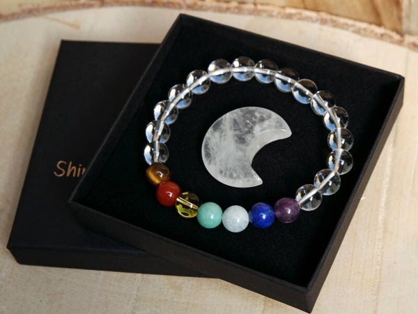 Edelsteenset bestaande uit een edelsteen-armband van bergkristal, amethist, lapis lazuli, tijgeroog, carneool, citrien, aventurijn en aquamarijn plus een bergkristallen maan, verpakt in een cadeaudoosje en ingepakt verzonden. Deze edelsteen-set is een mooi cadeau voor jezelf of een geliefde.