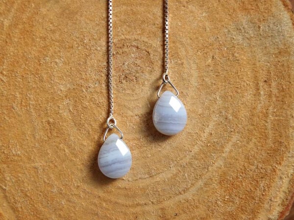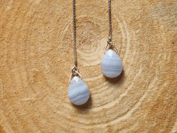 Deze threader oorbellen zijn gemaakt van sterling zilver en natuurlijk blue lace agaat (chalcedoon).