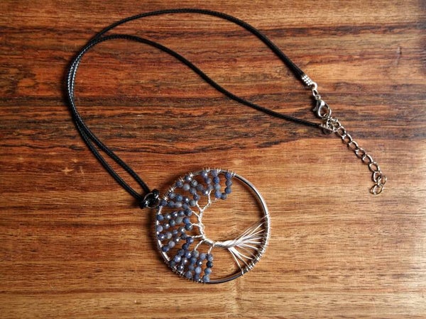 Met de hand gemaakte ronde levensboom-hanger, gemaakt van metaal en edelstenen. De diameter van de hanger is ongeveer 5cm.