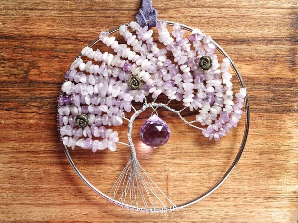 Met de hand gemaakte ronde wire wrapped levensboom-zonnevanger, ongeveer 13cm in diameter. Gemaakt met zilverkleurig metaaldraad, bloemen van pyriet, splitkralen van Cape Amethist en een lila regenboogkristal.