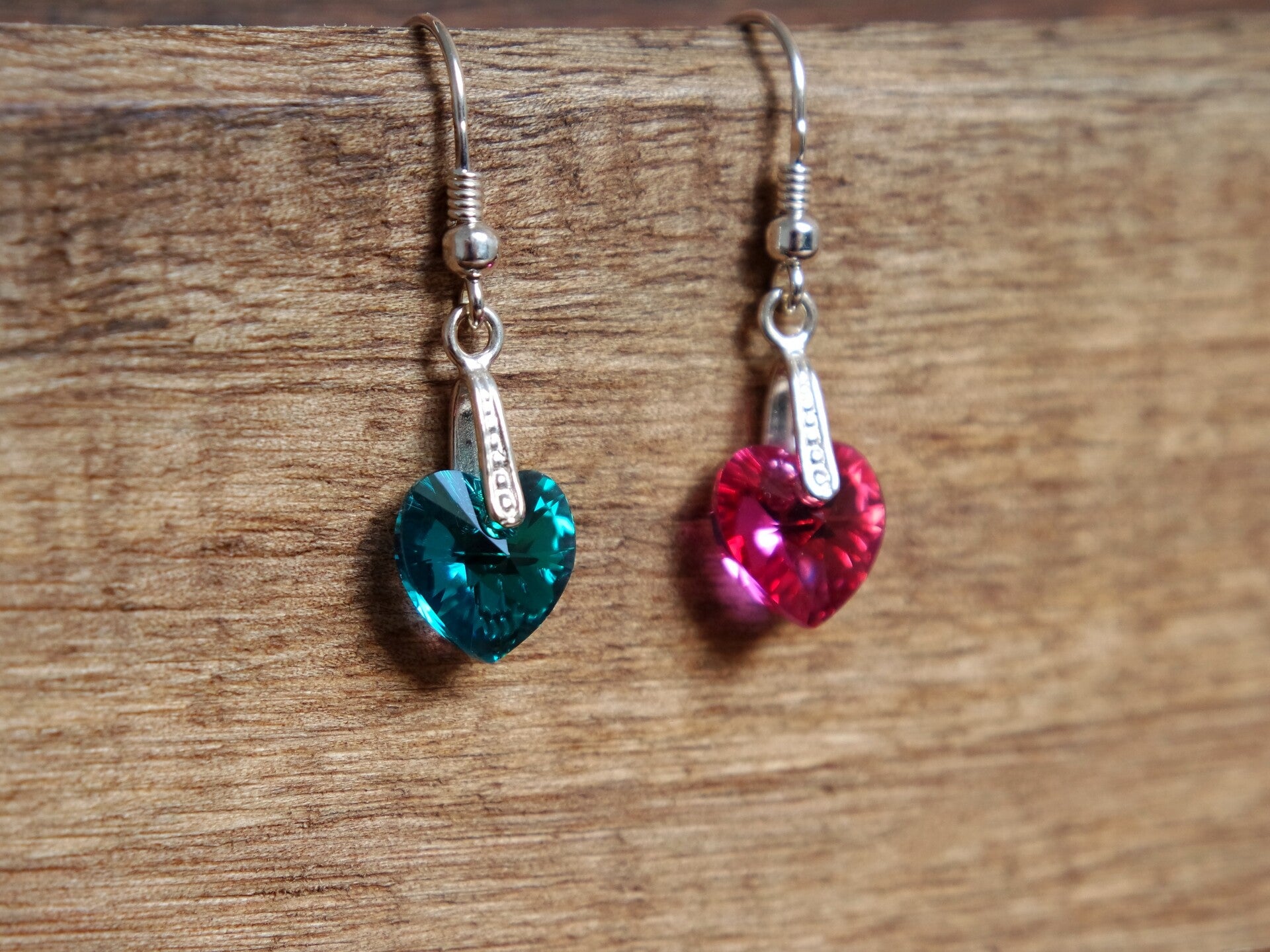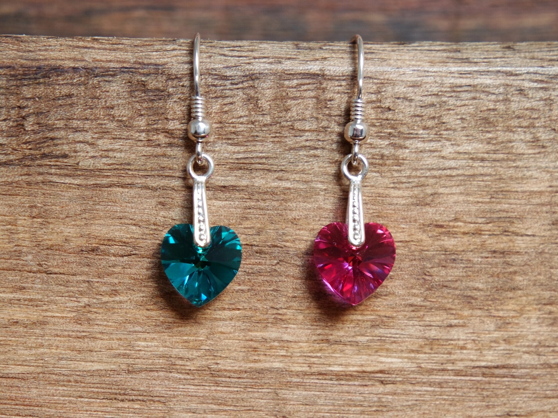 Sterling zilveren oorbellen met echte Swarovski® Elements: 10mm grote hartjes in de kleur Fuchsia AB & Blue Zircon AB. De totale lengte van de oorbellen is ongeveer 35mm