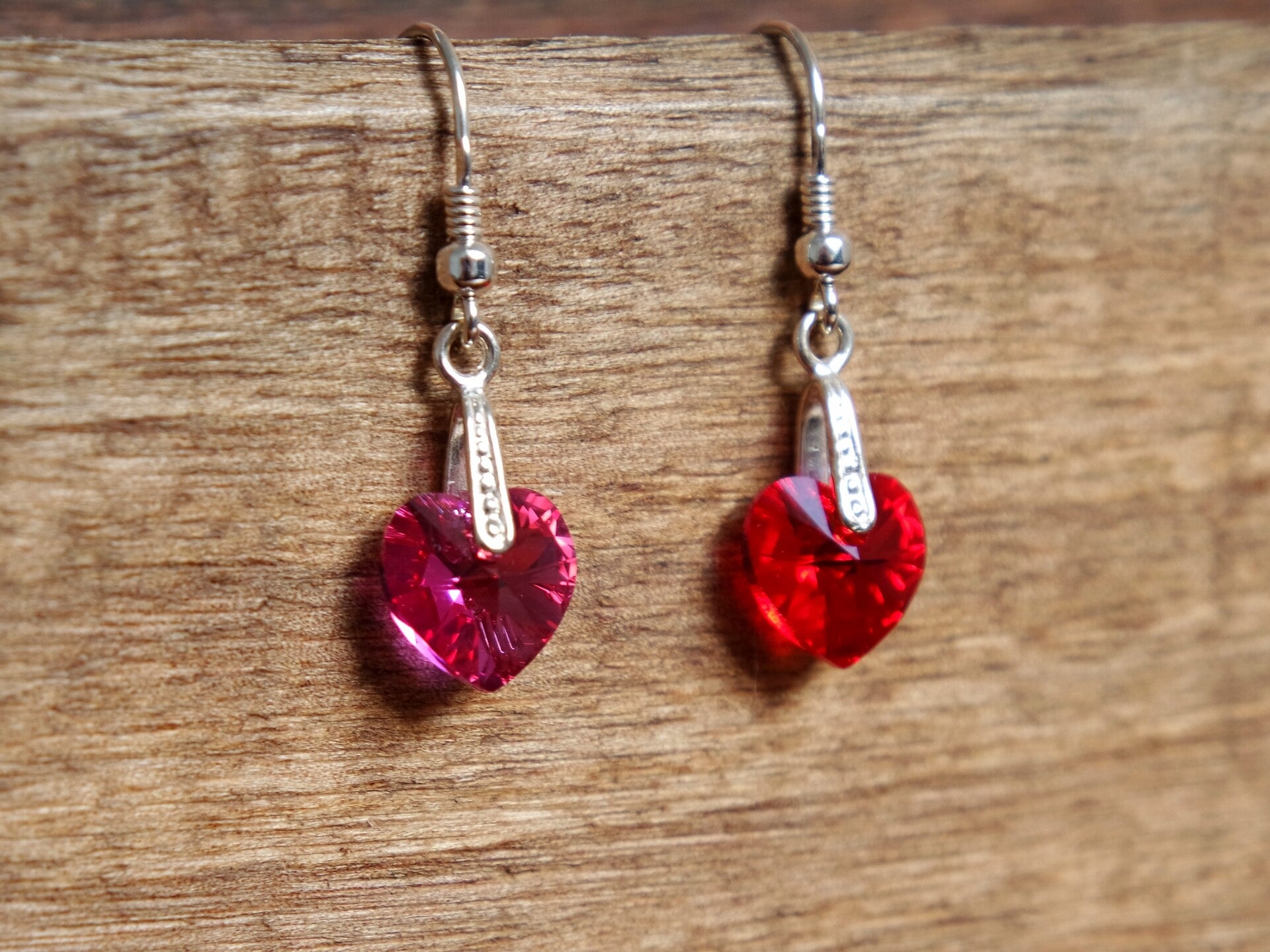 Sterling zilveren oorbellen met echte Swarovski® Elements: 10mm grote hartjes in de kleur Fuchsia AB & Light Siam AB. De totale lengte van de oorbellen is ongeveer 35mm