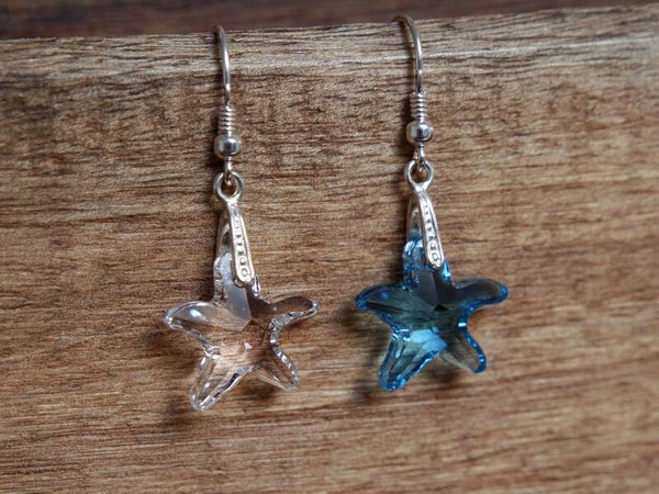 925 zilveren oorbellen met Swarovski® elements: zeesterren in de kleur aquamarine en crystal. De totale lengte van de oorbellen is ongeveer 39mm. De zeesterren zijn ongeveer 16mm lang en 17mm breed. Deze oorbellen zijn onderdeel van onze mismatched-collectie en hebben verschillende kleuren.
