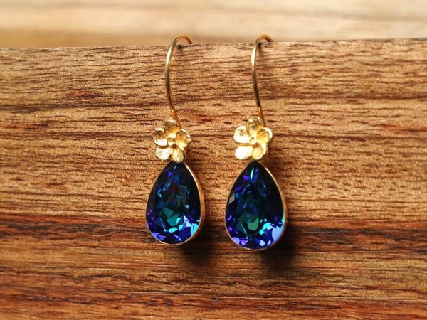 Sterling zilveren oorbellen met bloemen, verguld met 24K goud en met echte Swarovski elements: druppels in de kleur Bermuda