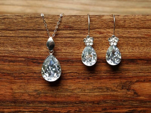 De Swarovski® Elements zijn gezet in sterling zilver, ook de ketting en oorhaken zijn gemaakt van sterling zilver.