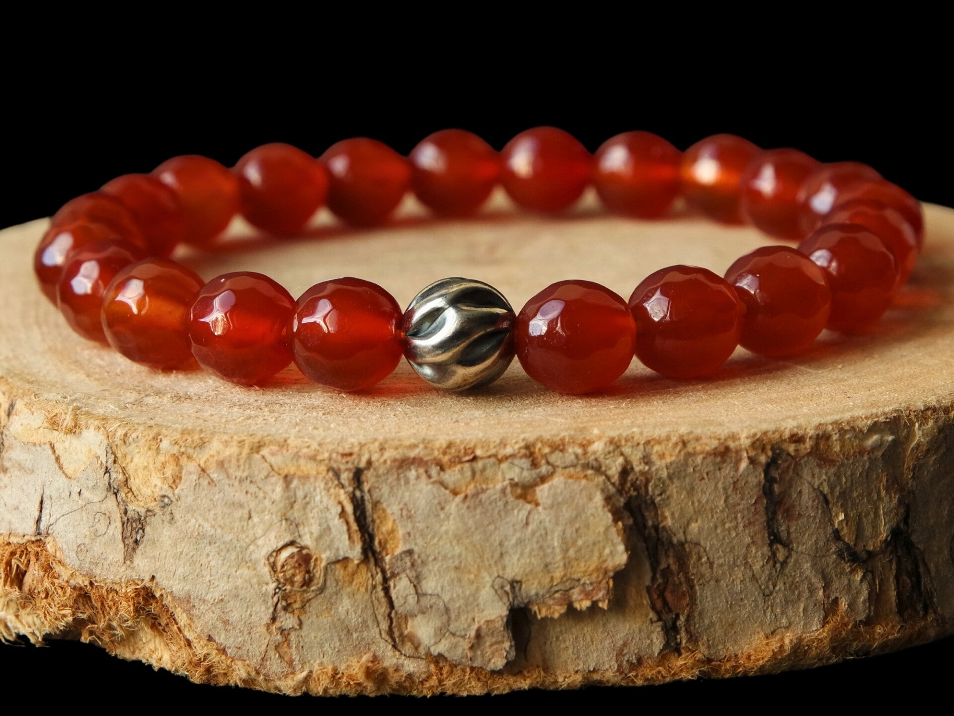Elastische armband van gefacetteerd carneool en een kraal van sterling zilver.