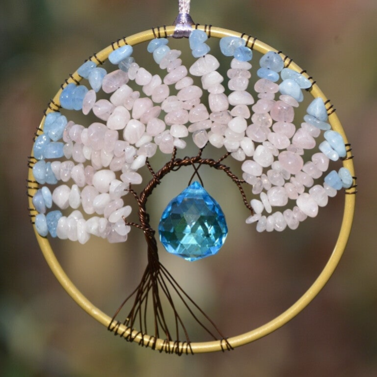Ronde wire wrapped levensboom-zonnevanger, ongeveer 10cm in diameter, gemaakt met metaaldraad, splitkralen van rozenkwarts en aquamarijn en een blauwe prisma.