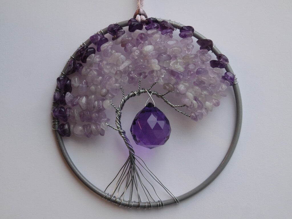 Ronde wire wrapped levensboom-zonnevanger, ongeveer 10cm in diameter, gemaakt met metaaldraad, splitkralen van cape-amethist en amethist en een paarse prisma.