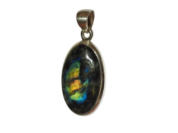 Exclusieve edelsteenhanger van Spectroliet uit Finland en sterling zilver. Spectroliet is donkergrijs met bijzondere flashes van andere kleuren, zoals blauw, groen, geel, roze en oranje. De precieze kleur is per steen verschillend en is sterk afhankelijk van het licht dat op de hanger schijnt.