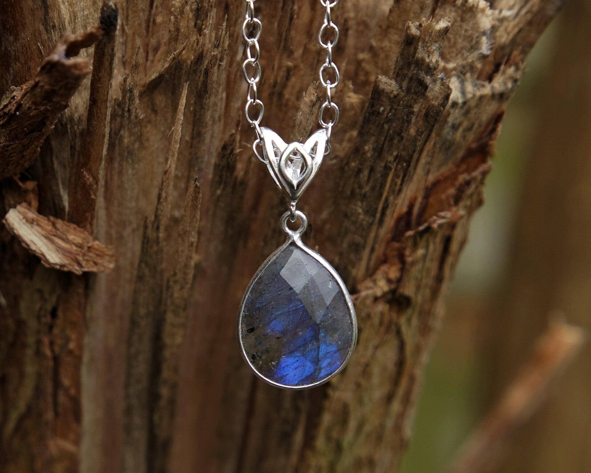 De zilveren ketting is circa 41cm, de gefacetteerde labradoriethanger is circa 18mm lang, exclusief het hangeroog (met hangeroog circa 27mm) en circa 12mm breed. De kleur van de steen varieert van een donker- tot lichtgrijs met een blauwige gloed en is afhankelijk van de hoeveelheid licht.