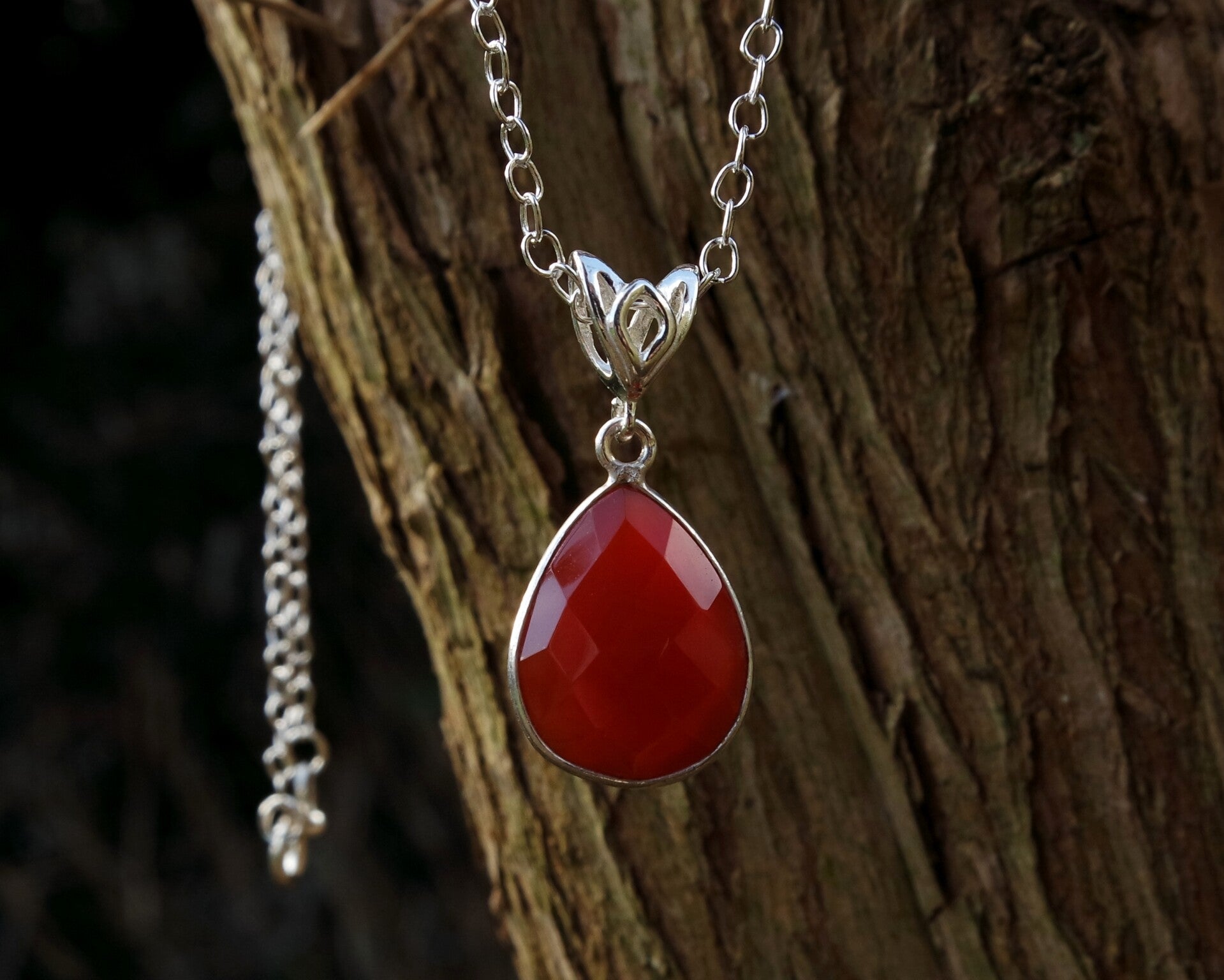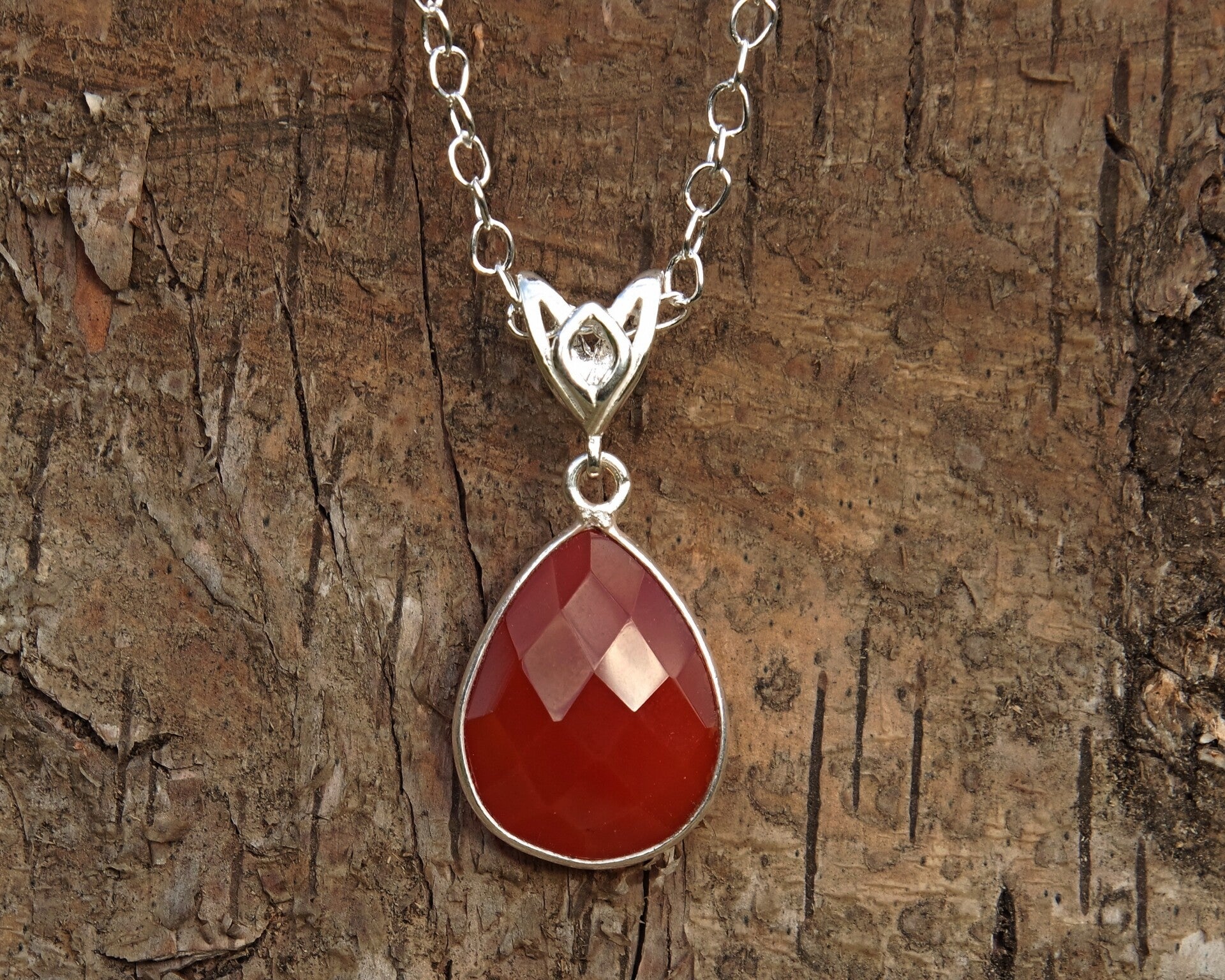 De zilveren ketting is circa 41cm, de gefacetteerde carneoolhanger is circa 18mm lang, exclusief het hangeroog (met hangeroog circa 27mm) en circa 13mm breed.