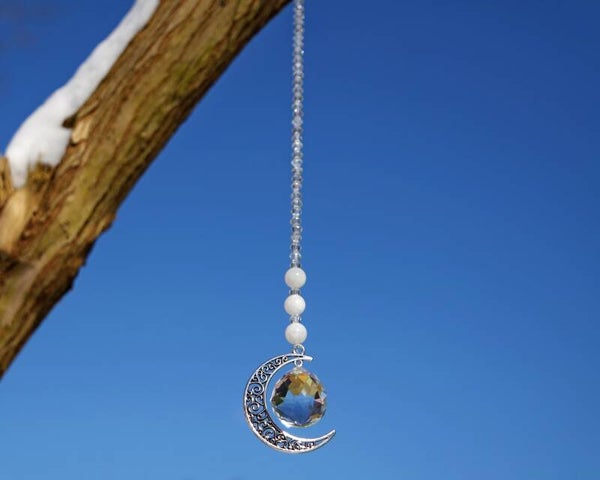 Zonnevanger met een metalen zilverkleurige maan, regenboogmaansteen en een regenboogkristal van 20mm