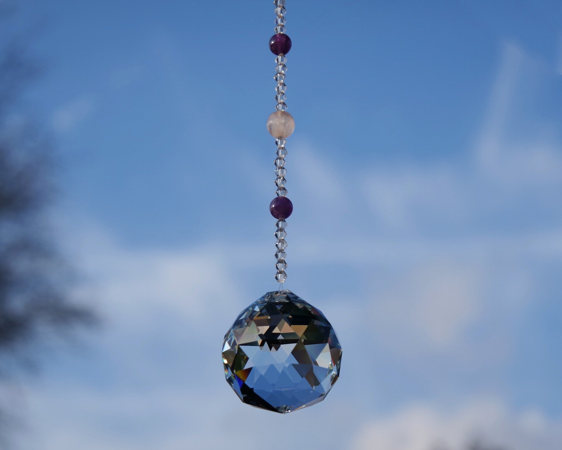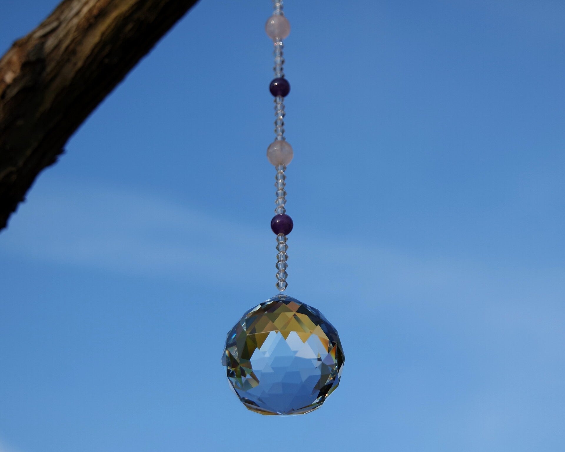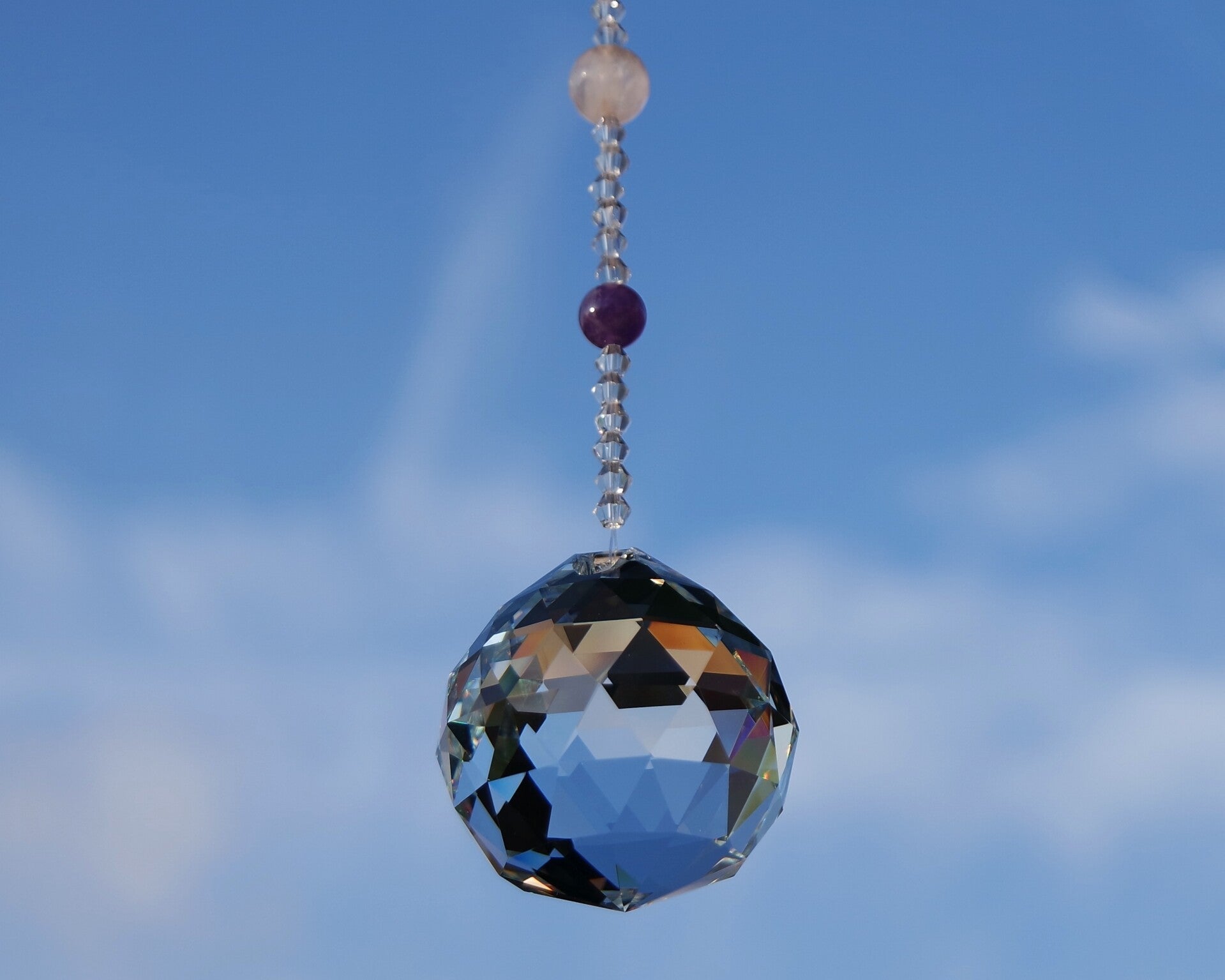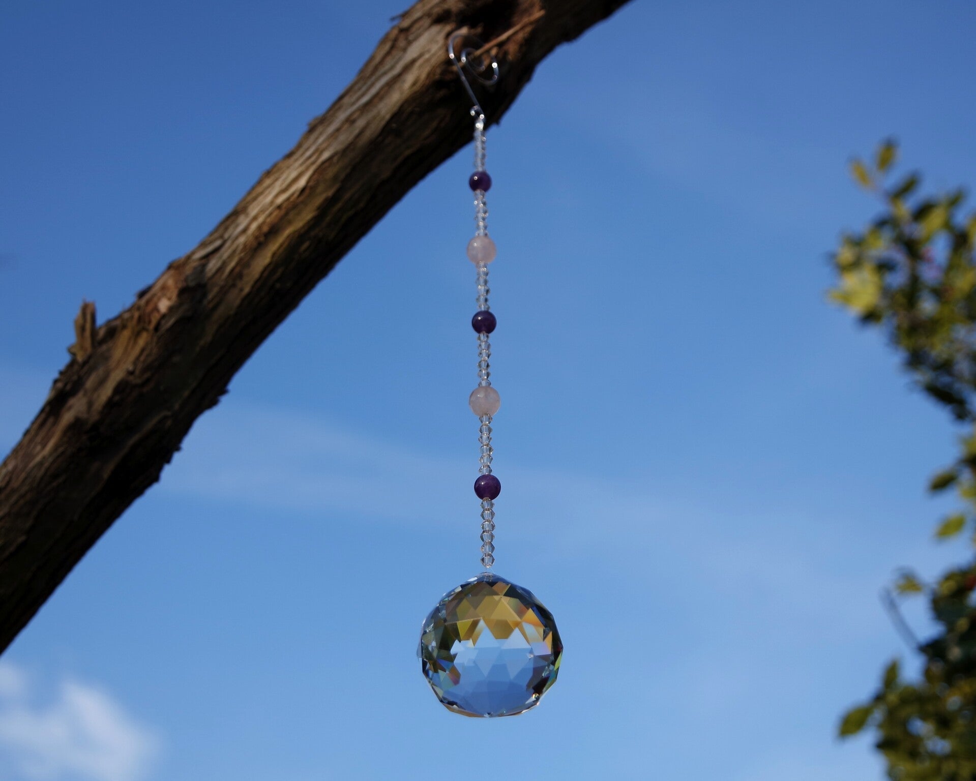 Rozenkwarts en Amethist-zonnevanger, gemaakt met gefacetteerde natuurlijke rozenkwartskralen, ronde natuurlijke amethistkralen en een regenboogkristal van 40mm