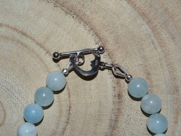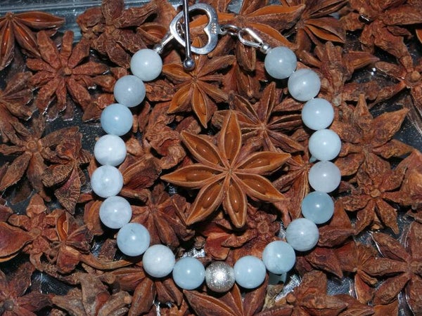 Armband van 8mm aquamarijnkralen, een sterling zilveren kraal en een sterling zilveren hartsluiting.