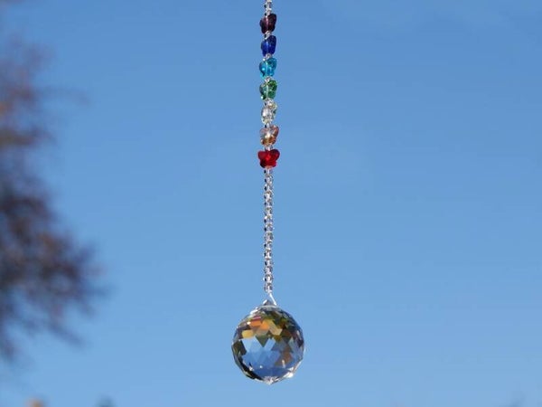Deze chakra-zonnevanger is ongeveer 27,5cm lang inclusief het haakje. Het regenboogkristal is ongeveer 30mm.