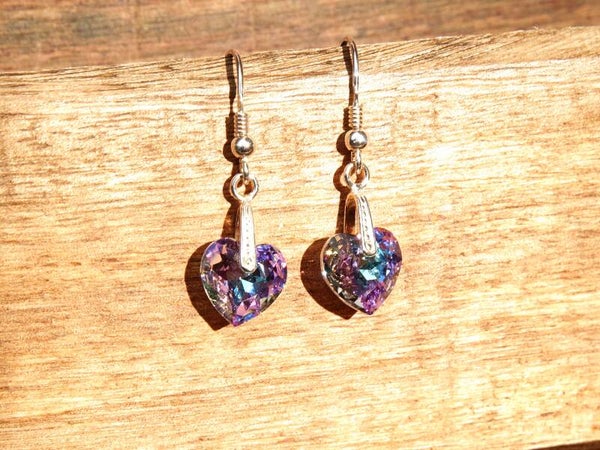 Sterling zilveren oorbellen met echte Swarovski® elements: 10mm grote hartjes in de kleur Crystal Vitrail Light. De totale lengte van de oorbellen is ongeveer 35mm