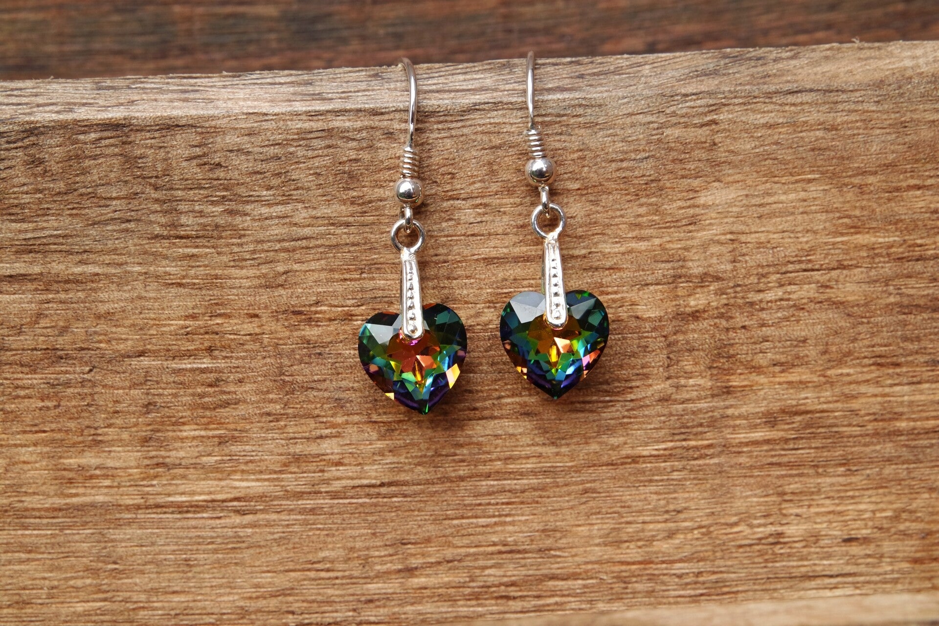 Sterling zilveren oorbellen met echte Swarovski® elements: 10mm grote hartjes in de kleur Crystal Vitrail Medium. De totale lengte van de oorbellen is ongeveer 35mm