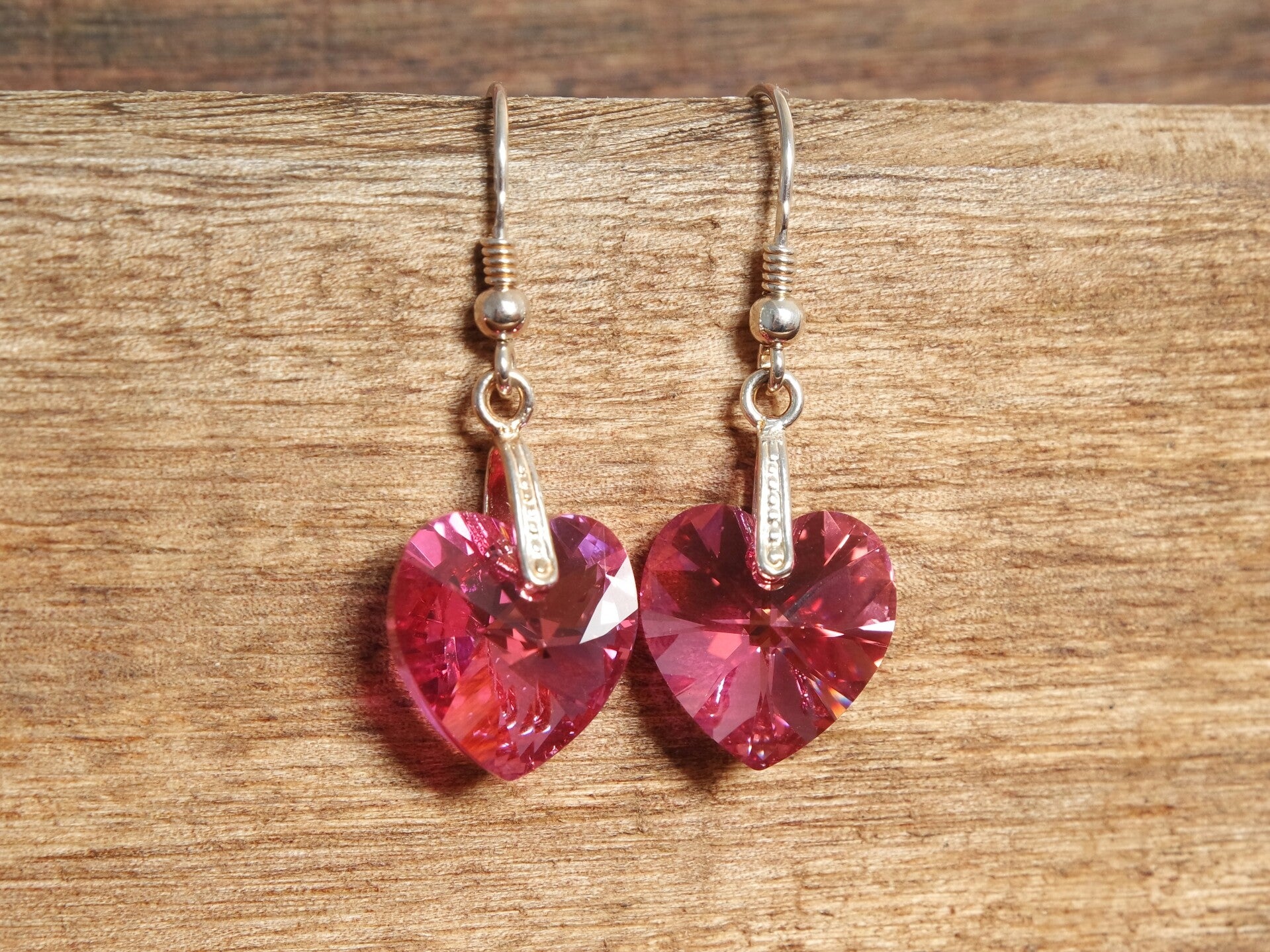 Sterling zilveren oorbellen met echte Swarovski® elements: hangertjes 'hart' in de kleur roze - Rose AB