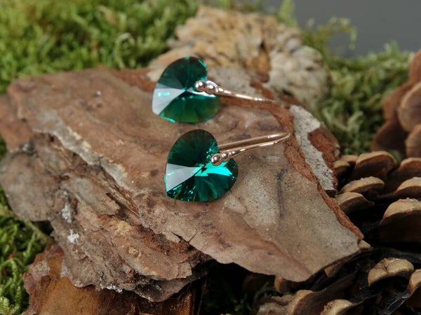 Sterling zilveren oorbellen, verguld met roségoud en met echte Swarovski elements: 14mm grote hartjes in de kleur groen (Emerald AB)