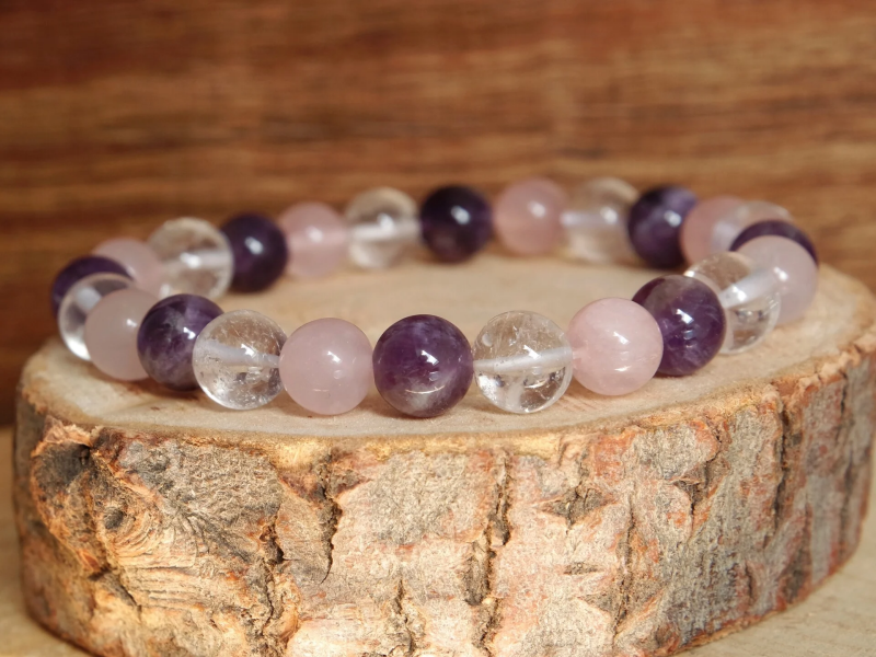 De combinatie van bergkristal, rozenkwarts en amethist creëert balans, rust en positieve energie.